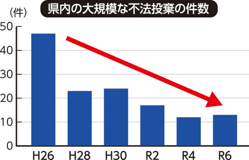 ここ数年、県内の不法投棄は減少傾向にありますが、撲滅には至っていません。公衆衛生や自然環境にも悪影響を及ぼす犯罪行為は1件たりとも見逃してはなりません。