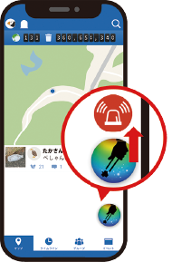 アプリ起動後、ごみ拾い投稿ボタンを上にスライドすると赤いアラートボタンが表示され、通報機能が立ち上がる。