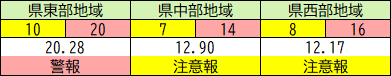 ・東・中・西の地域別では、県東部地域が感染拡大警報レベル、県中部、県西部地域が感染拡大注意報レベルとなっています。保健所管内別では、御殿場、富士、静岡市保健所管内が感染拡大警報レベル、賀茂、熱海、東部、中部、西部、浜松市保健所管内が感染拡大注意報レベルとなっています。