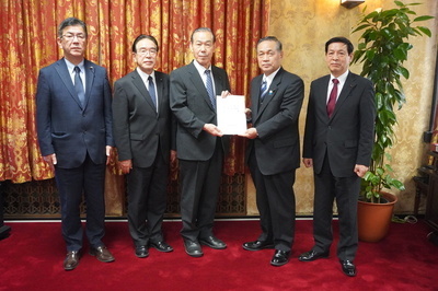 (左から阿部副委員長、相坂副委員長、竹内委員長、藪田議長、和田副議長)