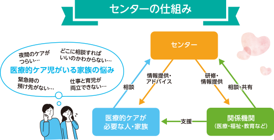 医療的ケアが必要な人やそのご家族などからのさまざまなご相談に総合的に対応するため、県は7月4日にセンターを開所しました。センターでは寄せられたご相談に医療・福祉・教育などの関係機関と協力しながら対応するとともに、情報提供などを行ってまいります。