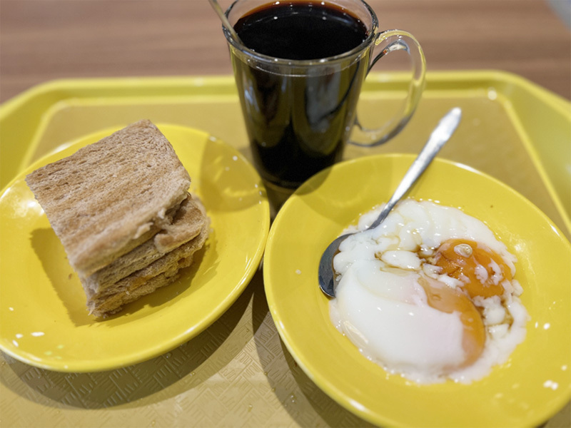 ▲定番の朝食。コピ(コーヒー)とカヤ(ココナッツ)トースト