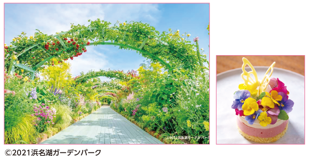 バラのアーチやスイレン、フジなど移り変わる景色が魅力的な庭園。庭園内の花博期間限定レストラン「ターブルブルーLENRI」では、花と静岡県産食材をテーマとして、舌も目も満足できる極上の料理を堪能できます。