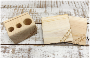 印鑑・メモスタンドは、切り込み箇所に、メモや写真が立てられます。3つの穴(大・小)には、シャチハタ、印鑑、ペンなどが立てられます。印鑑・メモスタンドおよびコースターに同じ三島柄をレーザー彫刻しています。シールとは違い、剥がれ落ちることはないので木の風合いとともに永年楽しむことができる製品です。