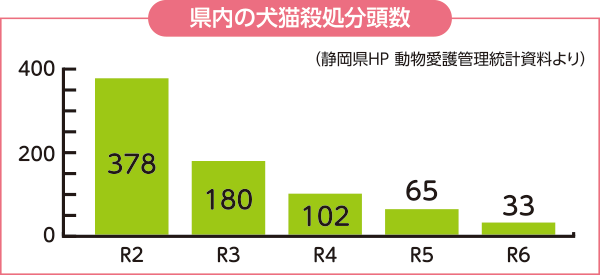 令和5年度の統計では、全国で年間44576頭の犬猫が保護され、そのうち9017頭が殺処分されました。県内でも昨年度は835頭の犬猫を収容、救えなかった命は33頭でした。