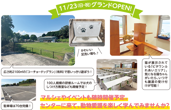 県の動物愛護の拠点となる施設で、愛称は「しっぽのバトン」です。動物愛護や適正飼育の啓発、犬猫の譲渡など、さまざまな活動をしていきます。