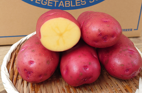 レッドムーンという品種のジャガイモ。赤い皮、黄金色の実色で煮崩れしにくいのが特長。風味や甘味が抜群