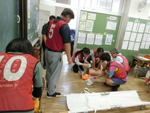 教職員を、被災児童役、居合わせた児童役、教員役と役割を決め、養護教諭不在中に実際に事故があったことを想定し、救命活動をしました。