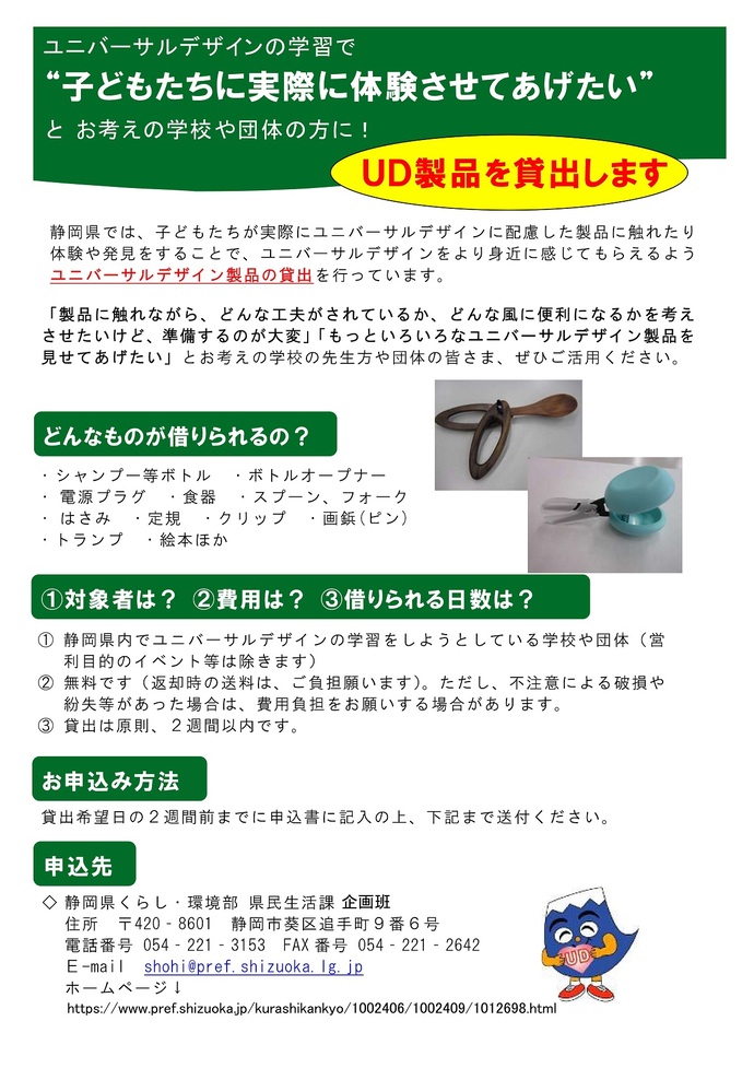 静岡県では、実際にユニバーサルデザインに配慮した製品に触れることができるよう、ユニバーサルデザイン製品の貸出を行っています。