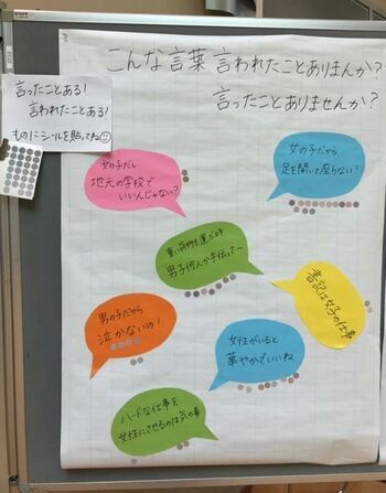 展示コーナーでは、性別について自分が言われたことがある、言った経験があるものにシールを貼って投票するというものがありました。