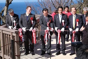 この日は岬の先まで続く新しいウッドウォークと展望デッキの開通式が行われ、その後にカップルがウッドウォークを歩き、先端にある展望デッキで結婚式を挙げました。また、カーネーションの無料プレゼントや、ウェディングドレスやタキシードに着替えての記念撮影、恋人宣言証明書発行など様々なイベントも行われました。