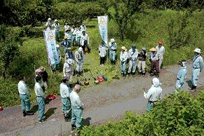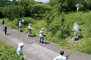 また、7月13日(土曜)には恋人岬美農里会会員の集落でもある小峰地域の一斉清掃があり、伸東測量設計株式会社の社員7名が参加しました。当日は2年前に美農里会と伸東測量設計株式会社が一緒に植樹した「土肥桜」周辺や、小峰地域内の高所を中心に草刈りを行いました。