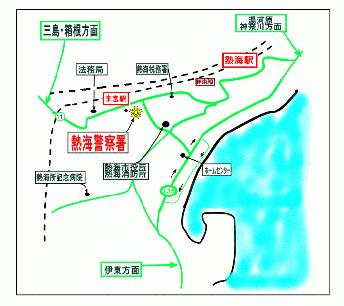 電車の場合 … 「熱海駅」からJR伊東線に乗り換え、「来宮駅」下車、徒歩約1分