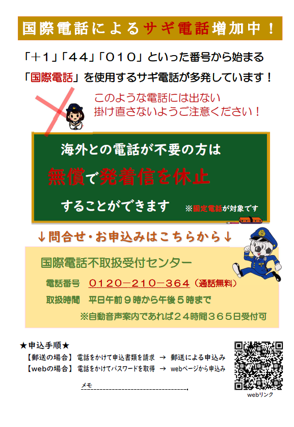 国際電話番号を使用したサギ電話や特殊詐欺被害が増加しています!