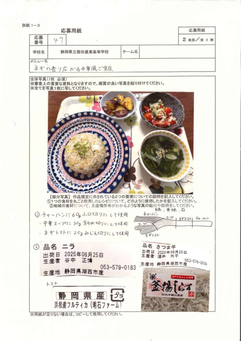 最優秀賞に磐田農業高校の大澤翠月さんの作品「ネギの香り広がる中華風ご飯」が選出されました!