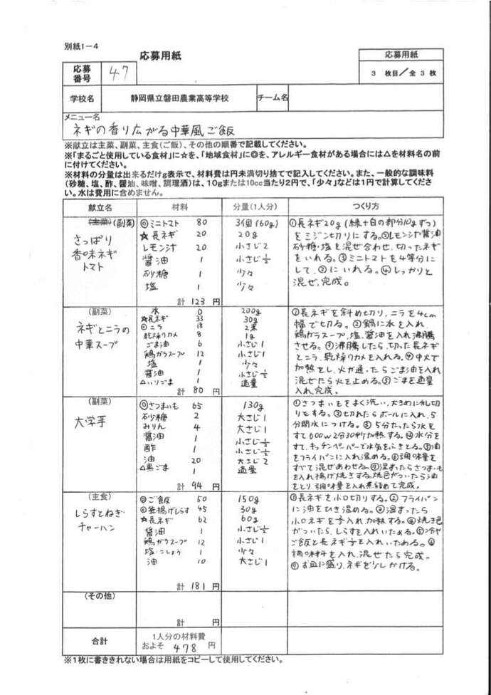 | 最優秀賞 | 大澤 翠月 | 磐田農業 | ネギの香り広がる中華風ご飯 |