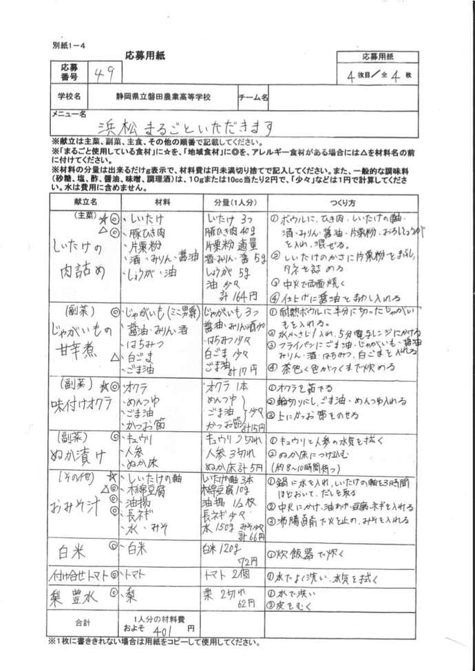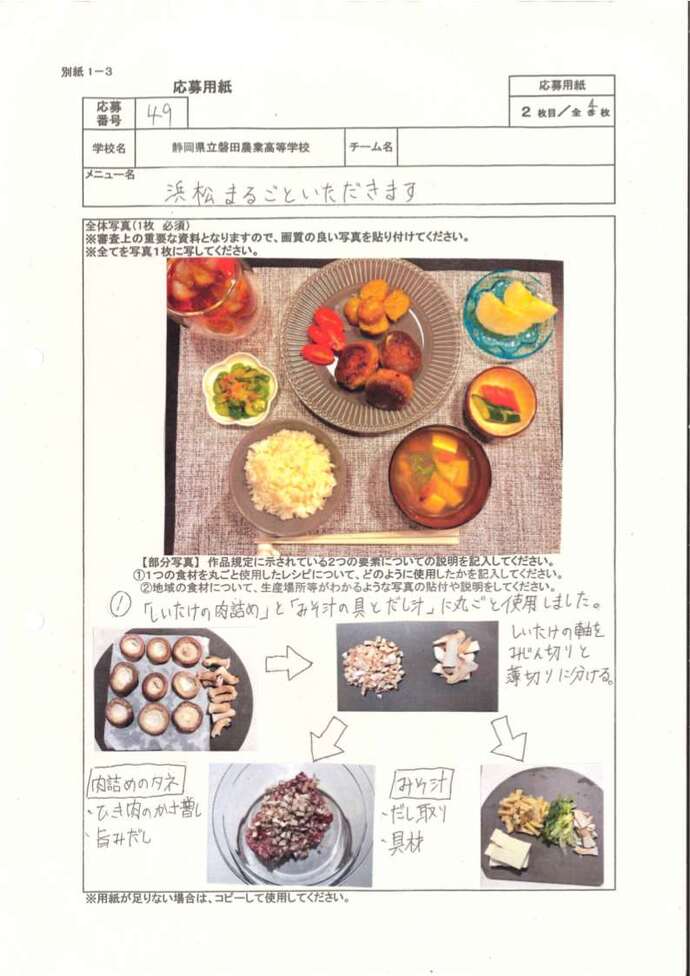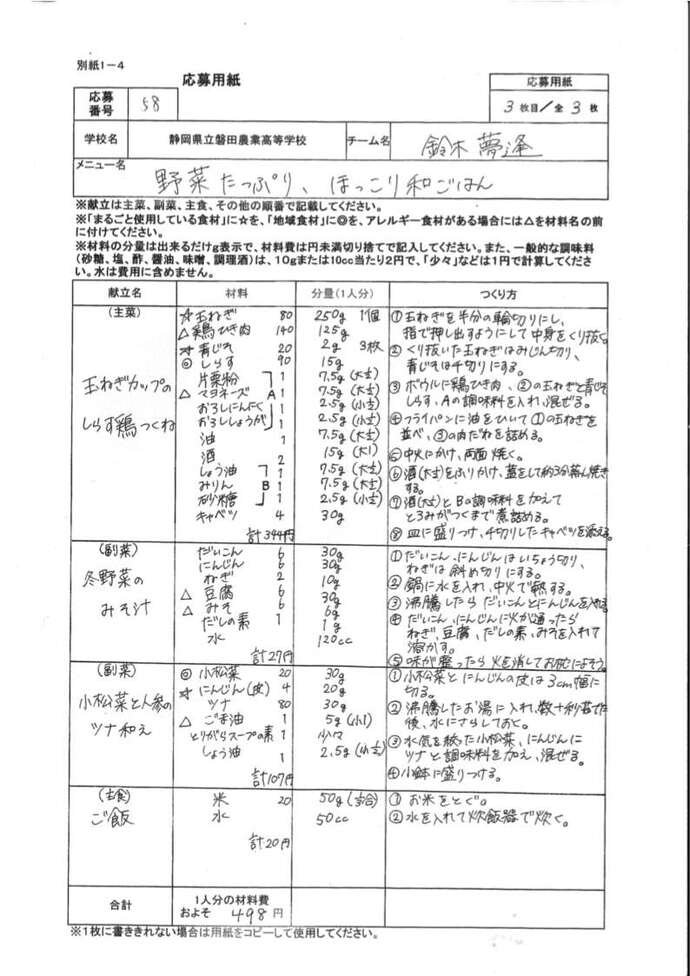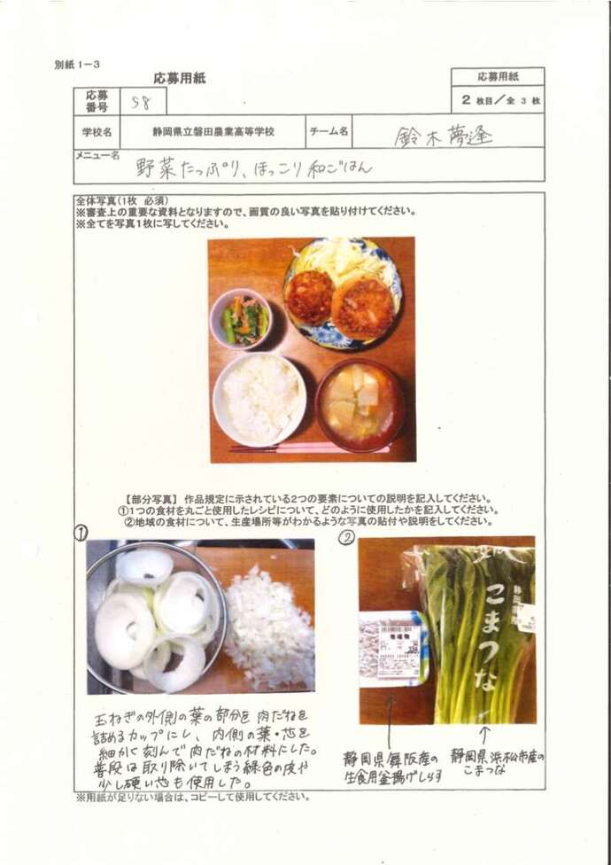 | 優秀賞 | 鈴木 夢逢 | 磐田農業 | 野菜たっぷり、ほっこり和ごはん |