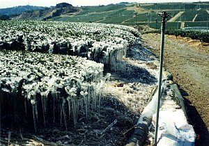 下の写真は、「散水氷結法」により茶葉を氷結させている状況です。気温が低下して凍霜害を受けるような時にスプリンクラーで散水し、茶に付着した水分が凍って潜熱を放出することを利用して新芽を保護するという方法です。