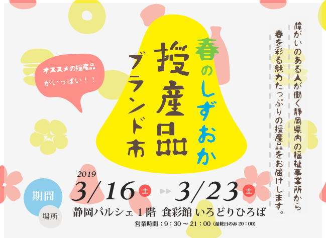 今回は、平成31年2月8日(金曜日)から「福祉事業所も販売する力を」をテーマに開催している、販売促進研修の実践編として、株式会社スリーパンズの久保田氏プロデュースのもと、平成31年3月16日(土曜日)から3月23日(土曜日)まで、静岡JR静岡駅ビルパルシェ1階食彩館いろどり広場にて「春のしずおか授産品ブランド市」を開催します。